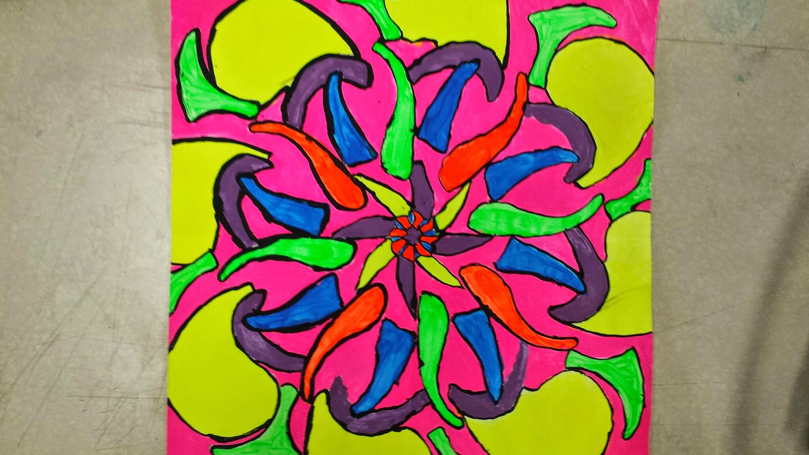 Again, the sun has gone down in my lassroom, and time for some night time fun. 8 four ft. bulbs are illuminating my students radial designs.