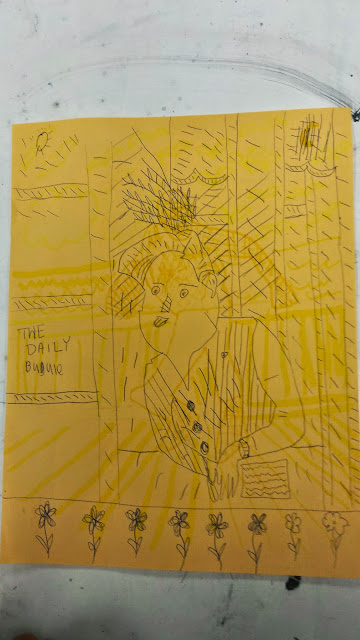 5. Once the transformation is complete, students then outline the image with colored markers, and fill in with colored pencils.